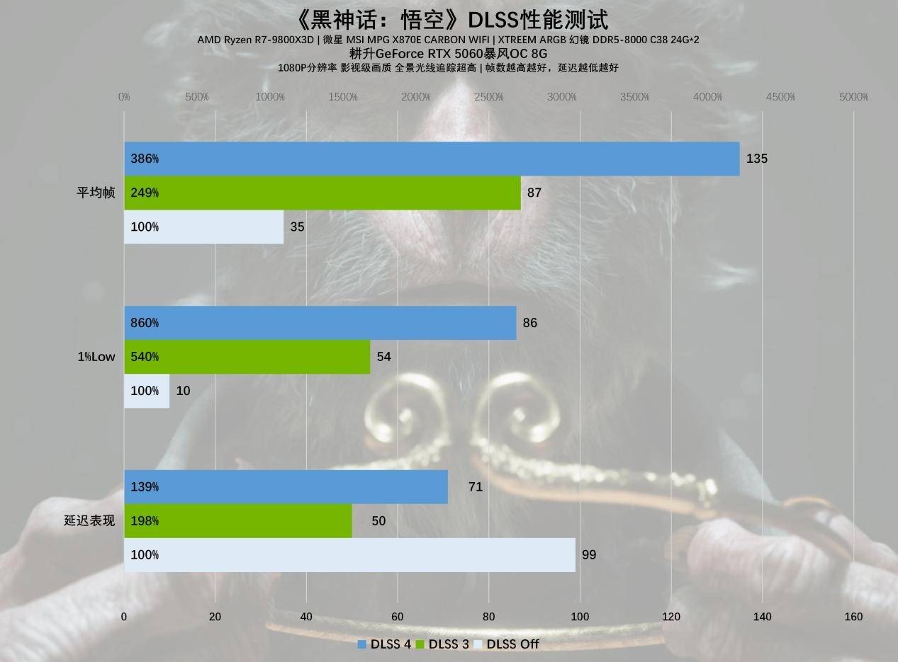 我们在1080P下将画质调整至影视级,全景光追也拉到最高,此时耕升RTX 5060暴风OC在不借助任何超分技术的条件下,游戏帧数仅有35 FPS。而有DLSS 3的帮助后,游戏帧数也回到了流畅的水准87 FPS;这时如果你有RTX 50系显卡,开启DLSS 4多帧生成以后,游戏帧数将再度飞跃,135 FPS的表现相当夸张,对比原生分辨率提升了快4倍,直接由可玩变爽玩了。