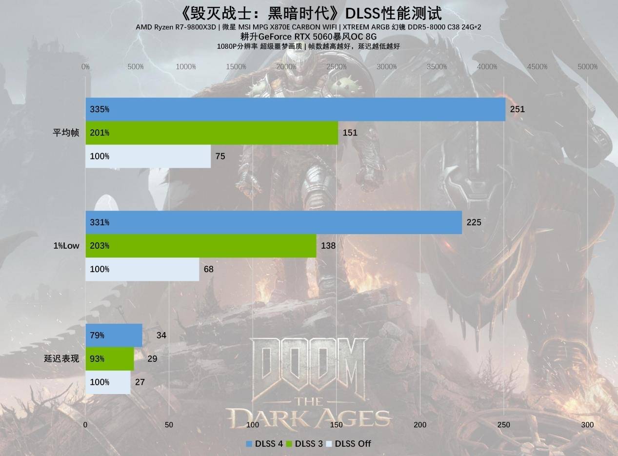 最后一款游戏我们测的是最近刚支持DLSS 4的《毁灭战士:黑暗时代》,实测耕升RTX 5060暴风OC显卡在1080P分辨率、超级噩梦画质下,表现还是非常不错的,即便不开启超分,也能流畅游戏;开启DLSS 3质量档后,游戏帧数已经能够满足高刷需求了,接着启动DLSS 4质量档后,游戏帧数更是来到了250 FPS以上,完全的爽玩水准。