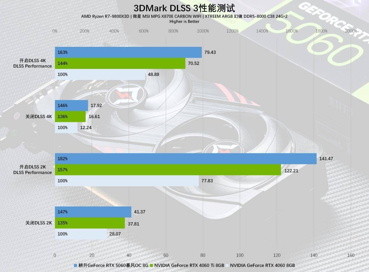 首先是3DMark的DLSS 3性能测试。耕升RTX 5060暴风OC在2K分辨率下,对比RTX 4060,性能提升幅度非常夸张,达到了82%,对比RTX 4060 Ti则是25%;4K分辨率下,开启DLSS 3以后,对比RTX 4060性能领先也基本维持在80%以上,而对比RTX 4060 Ti同样拉开了不小的差距,接近40%的性能提升只能说老黄确实有点东西。