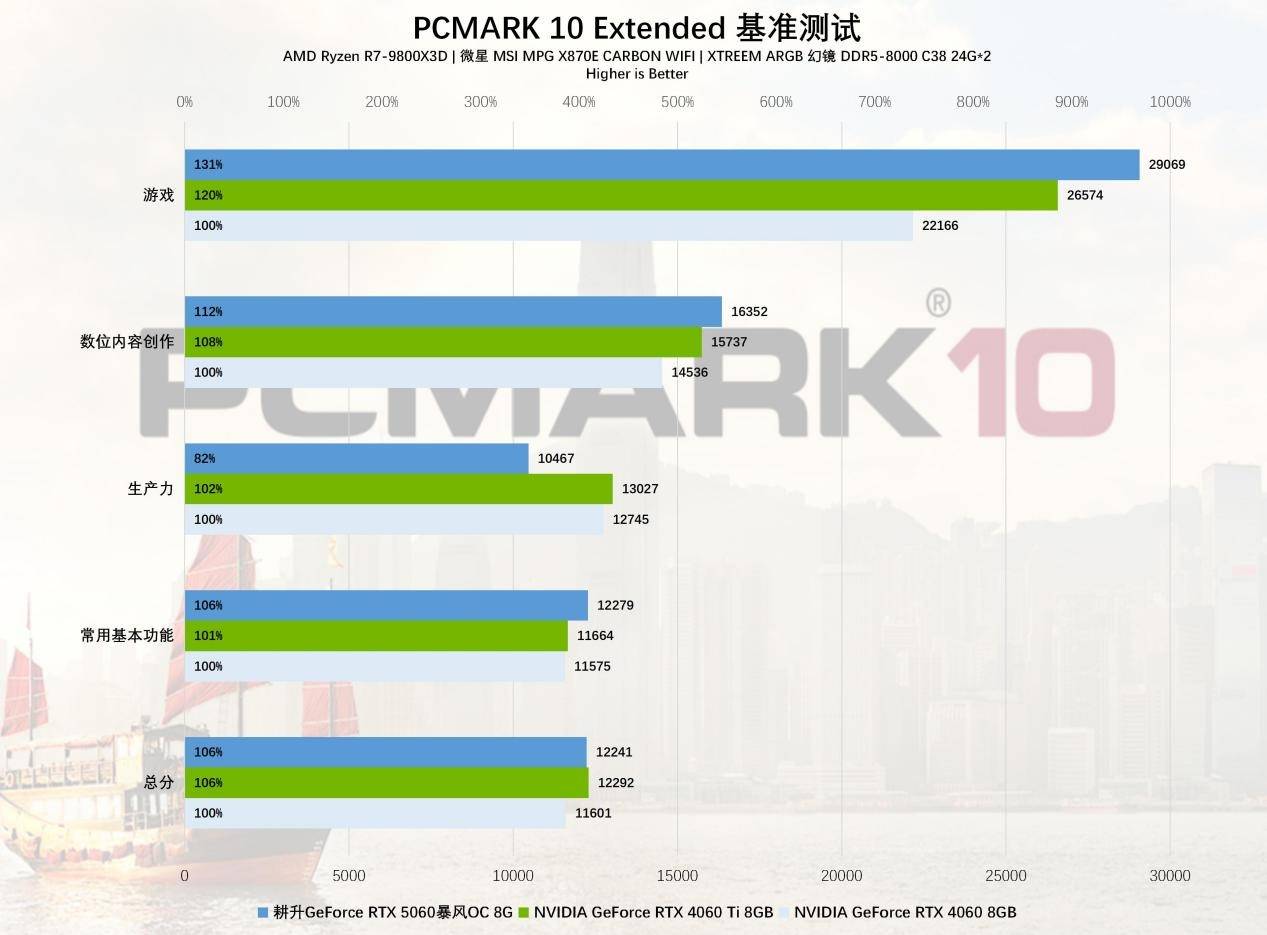 在理论性能的评估中,通过3DMark的Fire Strike系列测试,耕升RTX 5060暴风OC的表现令人瞩目。在1080P分辨率下,其性能相较于RTX 4060领先约39%,与RTX 4060 Ti相比也有18%的性能优势;在2K分辨率下,领先RTX 4060约43%,领先RTX 4060 Ti约22%;而在4K分辨率下,与RTX 4060的差距最大,性能提升达到50%,与RTX 4060 Ti相比也有27%的提升。此外,在以DX12为基准的Time Spy测试中,新显卡同样表现出色,相较于RTX 4060领先幅度达到37%,整体性能的提升相当显著。