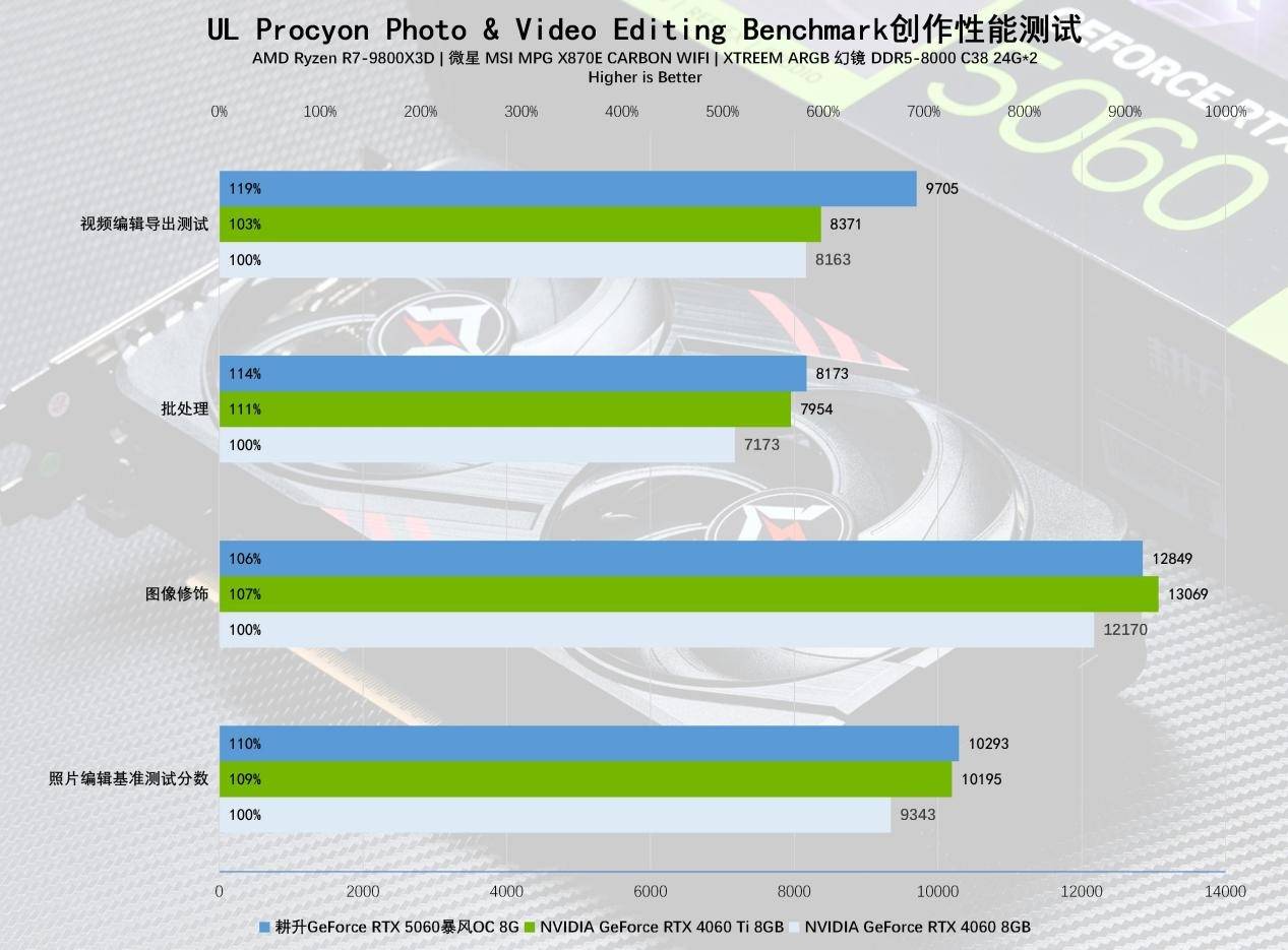 再看大伙关心的图像编辑与视频创作表现,我们采用UL Procyon进行测试,在图像编辑上耕升RTX 5060暴风OC与RTX 4060 Ti不相上下,不过对比RTX 4060时,性能领先9%左右,而在视频剪辑方面,耕升RTX 5060暴风OC的优势就比较大了,对比RTX 4060以及RTX 4060 Ti分别领先19%和16%。