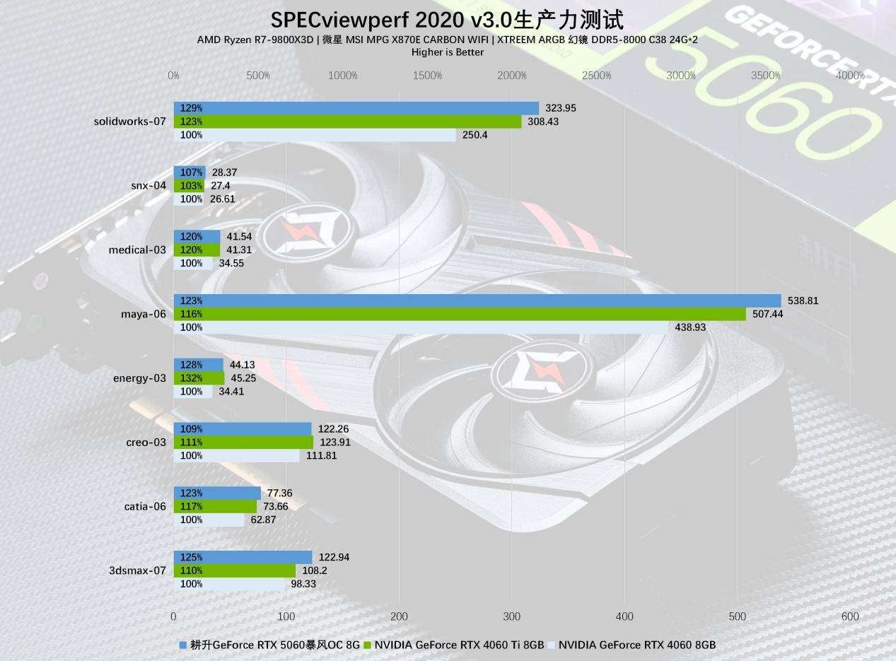 工业领域我们用的是SPEC2020进行测试,它能够反映显卡的整体工业能力,在多项测试中耕升RTX 5060暴风OC对比RTX 4060平均有20%的提升,部分项目领先幅度更大,而对比RTX 4060 Ti,两者也是互有胜负。
