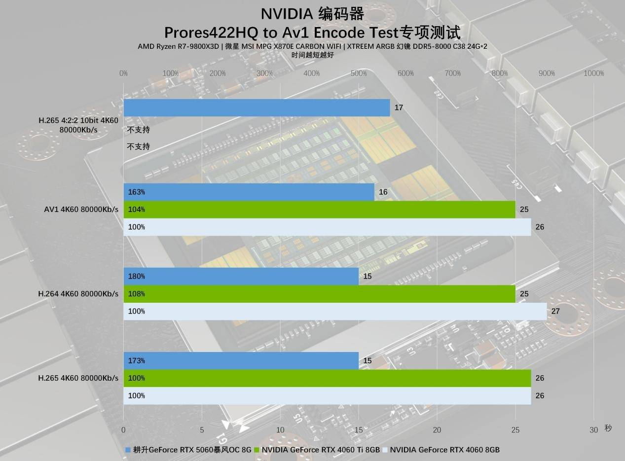 在Adobe以及达芬奇的Benchmark测试里,耕升RTX 5060暴风OC相比两张前代的60级别显卡也是有不小的提升,不过提升比较大的还是视频编辑部分,究其原因还是这一代RTX 50系显卡对编码器进行了升级,不仅编解码的效率更高,同时支持的格式也更丰富。例如在达芬奇和PR的测试中,耕升RTX 5060暴风OC领先RTX 4060与RTX 4060 Ti超22%以上,总体来说就是内容创作的效率更高了。