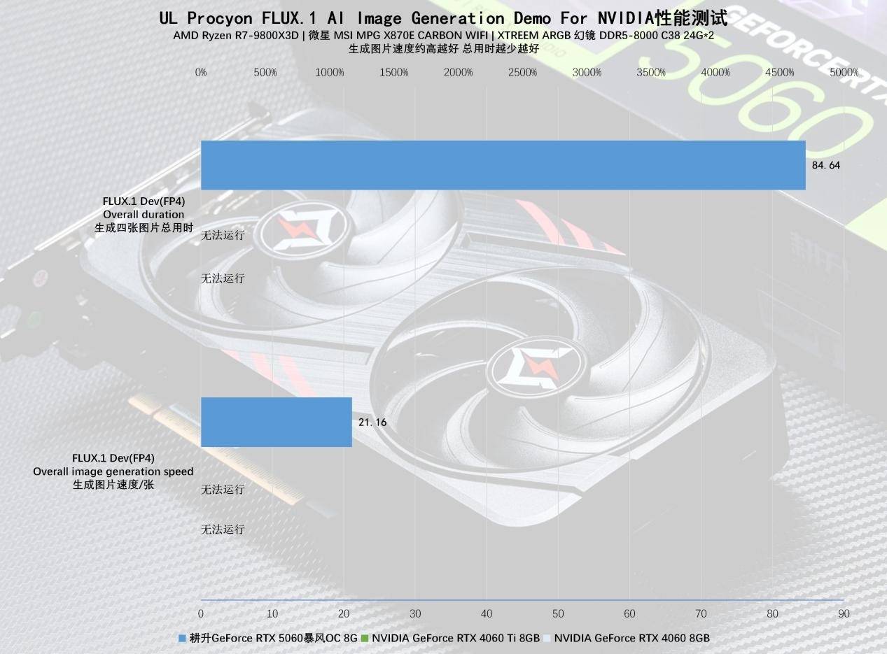 实测前代的两张60级别显卡因为显存不足,无法完成测试任务。而同样是8GB显存的耕升RTX 5060暴风OC凭借FP4精度模型的支持,能够顺利跑完测试,生成一张图片的用时为21.16秒,表现还不错。