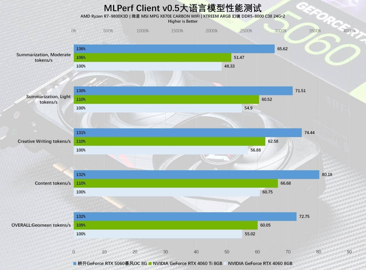 接着是本地大模型部署测试,我们用MLPerf Client v0.5大语言模型进行测试,它是基于meta的Llama 2 7B开源LLM打造,涵盖了四项AI任务,分别是内容生成、创意写作以及对两份不同长度文本进行总结摘要。实测新显卡在每一项中都表现出了绝对的统治力,各项测试均遥遥领先,对比RTX 4060 Ti性能提升幅度为20%,而对比RTX 4060则更进一步,领先约30%!