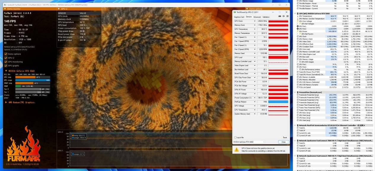 最后一项测试烤机,这也是许多玩家关注的重点。得益于耕升RTX 5060暴风OC出色的散热配置,整体表现非常出色。在室温23℃下,Furmark烧机10分钟后,整张显卡的温度并不高,核心仅有68.6度出头,显存温度则低于62度,非常凉快。显卡的功率则为155 W,风扇转速则是2230 RPM,高转速做成的噪音有点略高,但基本1米外声音已不太明显。