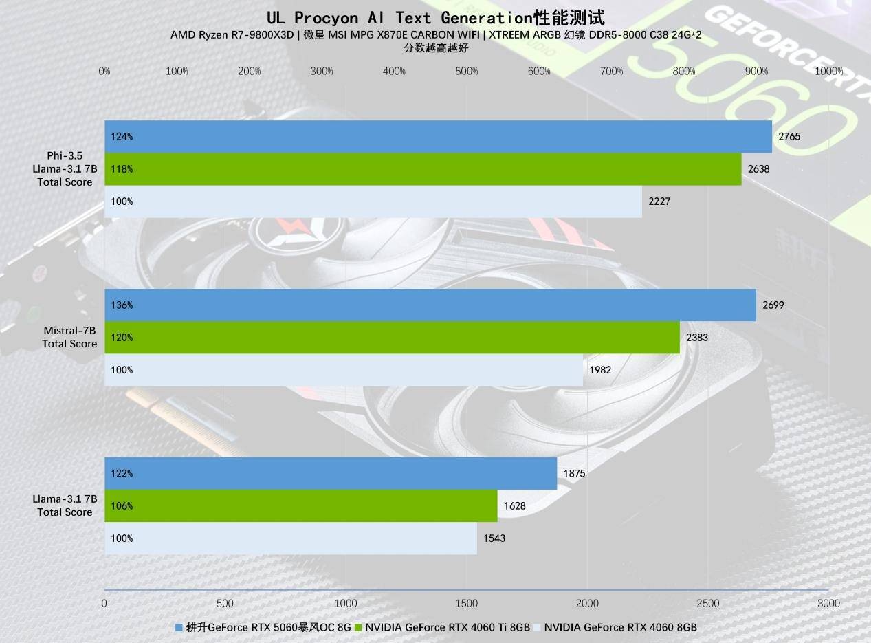 接着我们又用UL Procyon的AI Text Generation测试了更多的大语言模型,耕升RTX 5060暴风OC的优势依旧十分明显,综合性能对比RTX 4060提升约27%,面对RTX 4060 Ti,性能也有13%的领先优势。