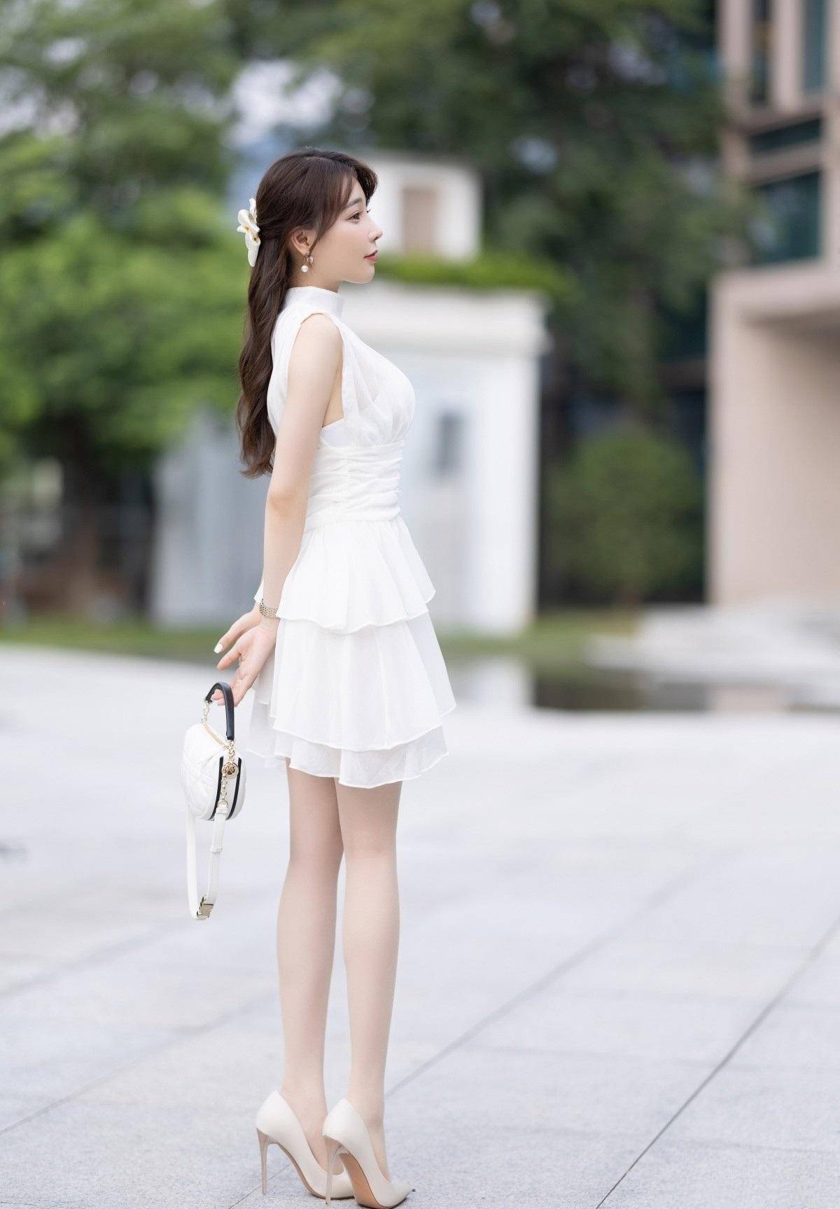— 时尚穿搭:徐莉芝白色蓬蓬纱连衣裙搭配高跟鞋,气质高雅妩媚迷人 —