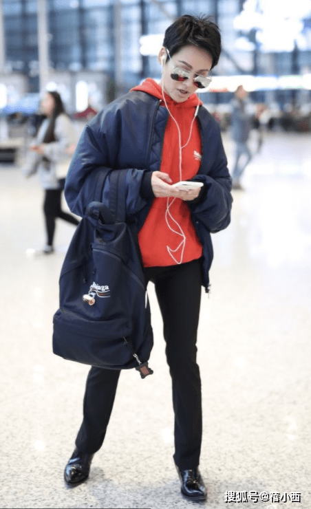 — “宁静”在机场放飞自我,穿棉服配红色卫衣,剪了短发似假小子 —