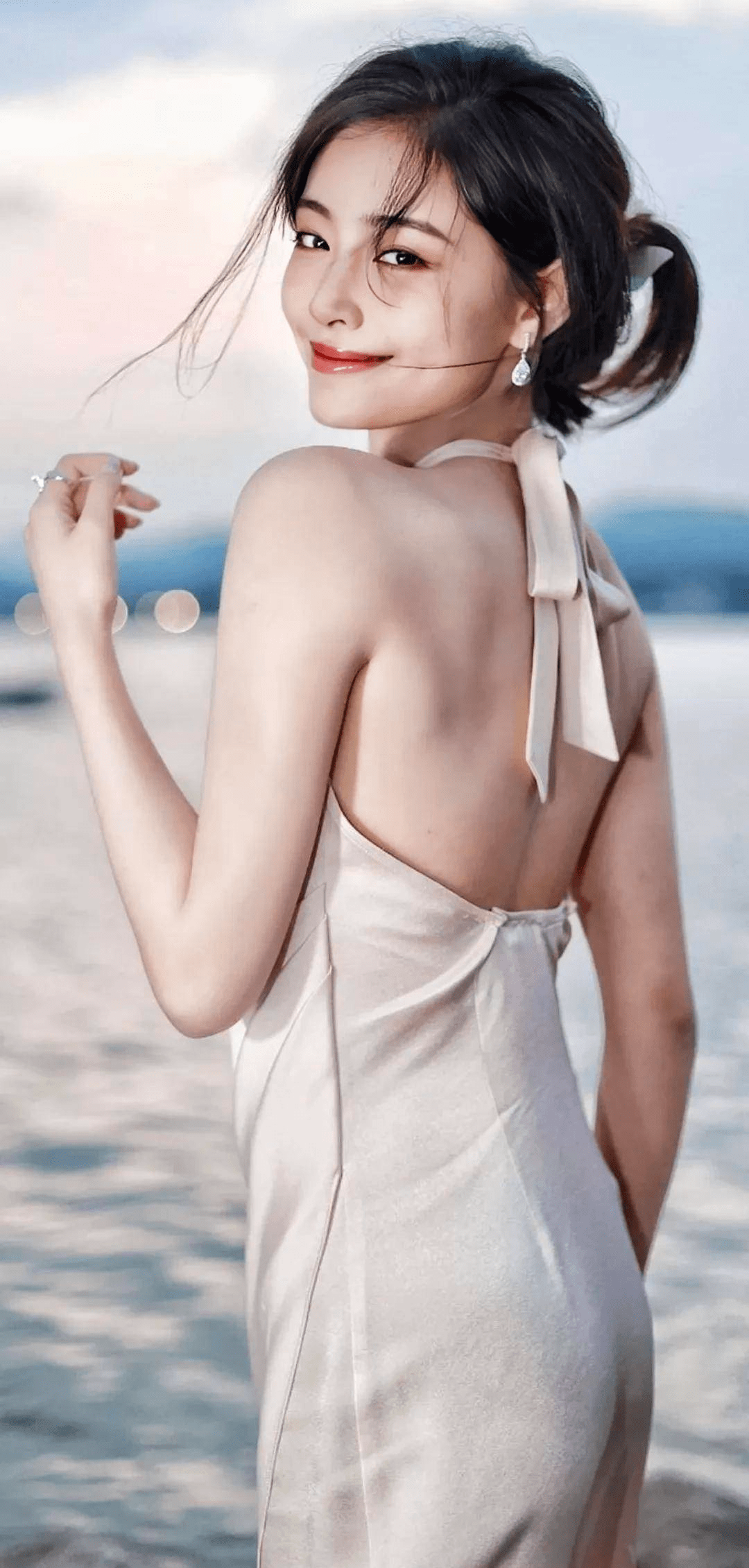 — 身穿露背丝绸连衣裙优雅可爱,丸子头尽显女人味 —