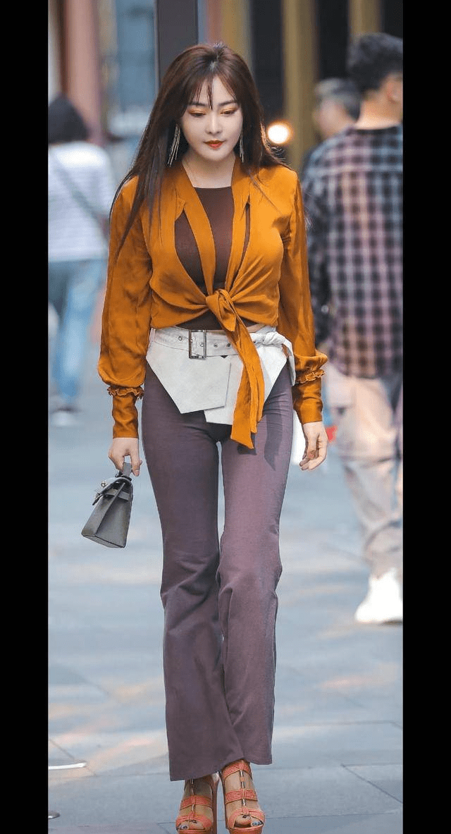 — 想要显得个子高,可以选择一双防水台高跟鞋搭配微喇长裤! —