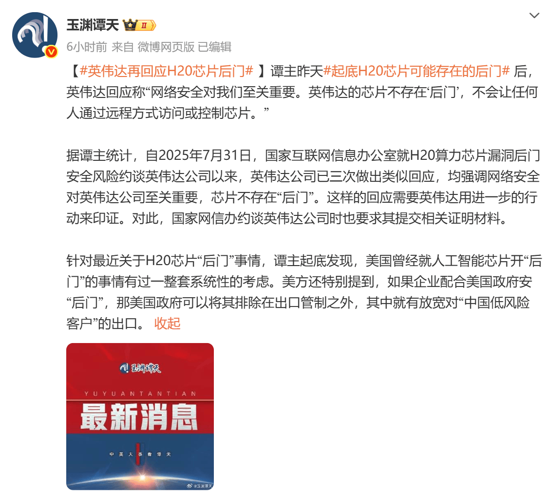 — 央媒质疑H20芯片存在后门风险 英伟达三度回应否认 —