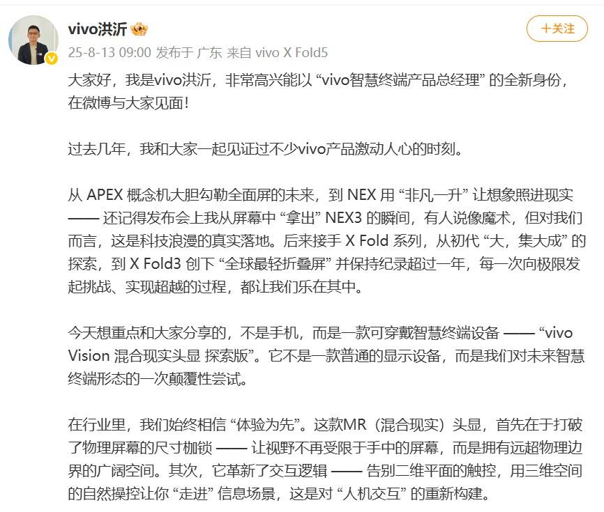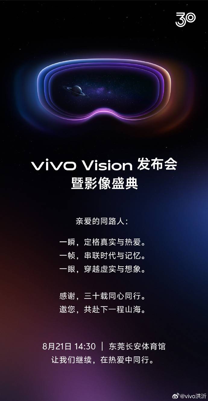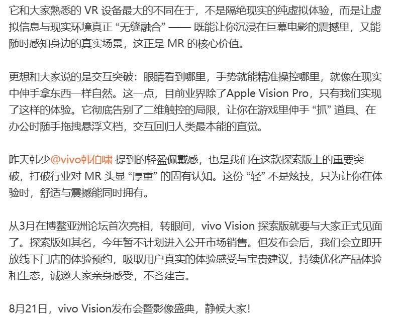 — vivo Vision MR头显探索版 8 月 21 日发布!仅线下开放体验,不对外销售 —