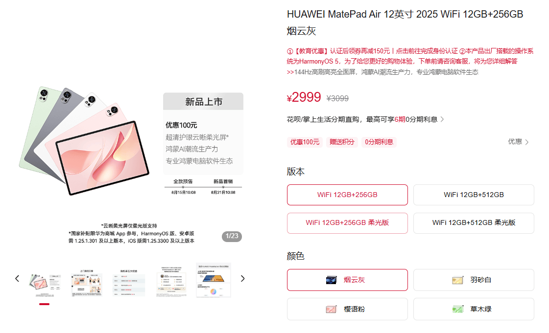 — 华为MatePad Air 12英寸2025平板电脑发布:全系12GB运存,3099元起 —