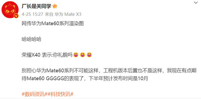 — 华为或于10月推出Mate60系列手机,最新渲染图流出 —