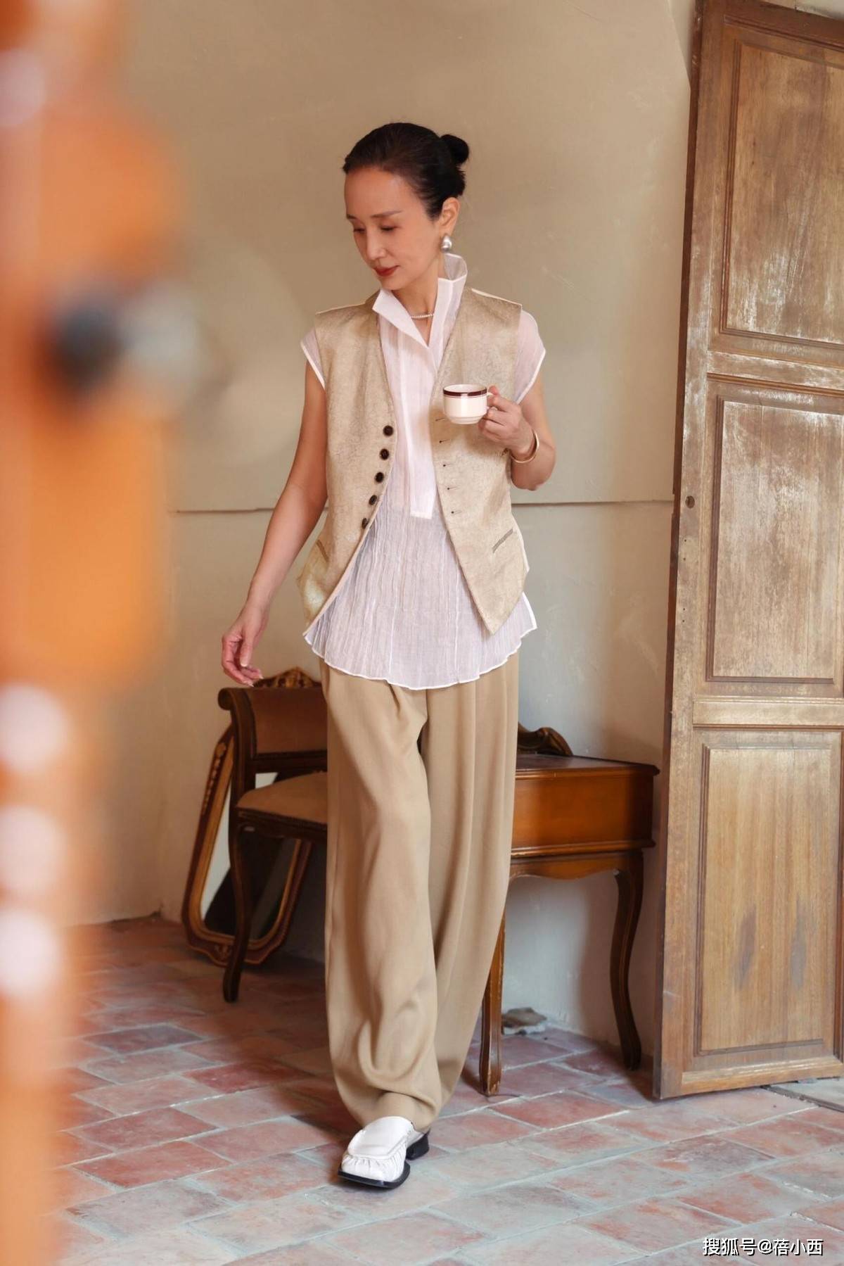 - 郭晶晶与闺蜜在豪宅里聚会!穿V领衬衫+针织衫,高级、显贵又松弛