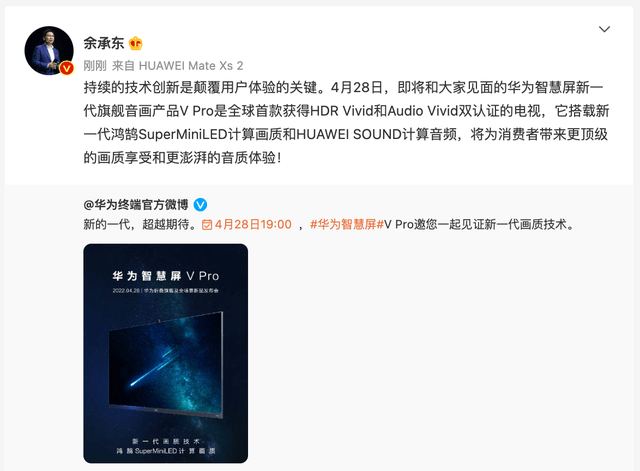 — HDR Vivid和Audio Vivid双认证加持,华为智慧屏V Pro 4月28日将发布 —