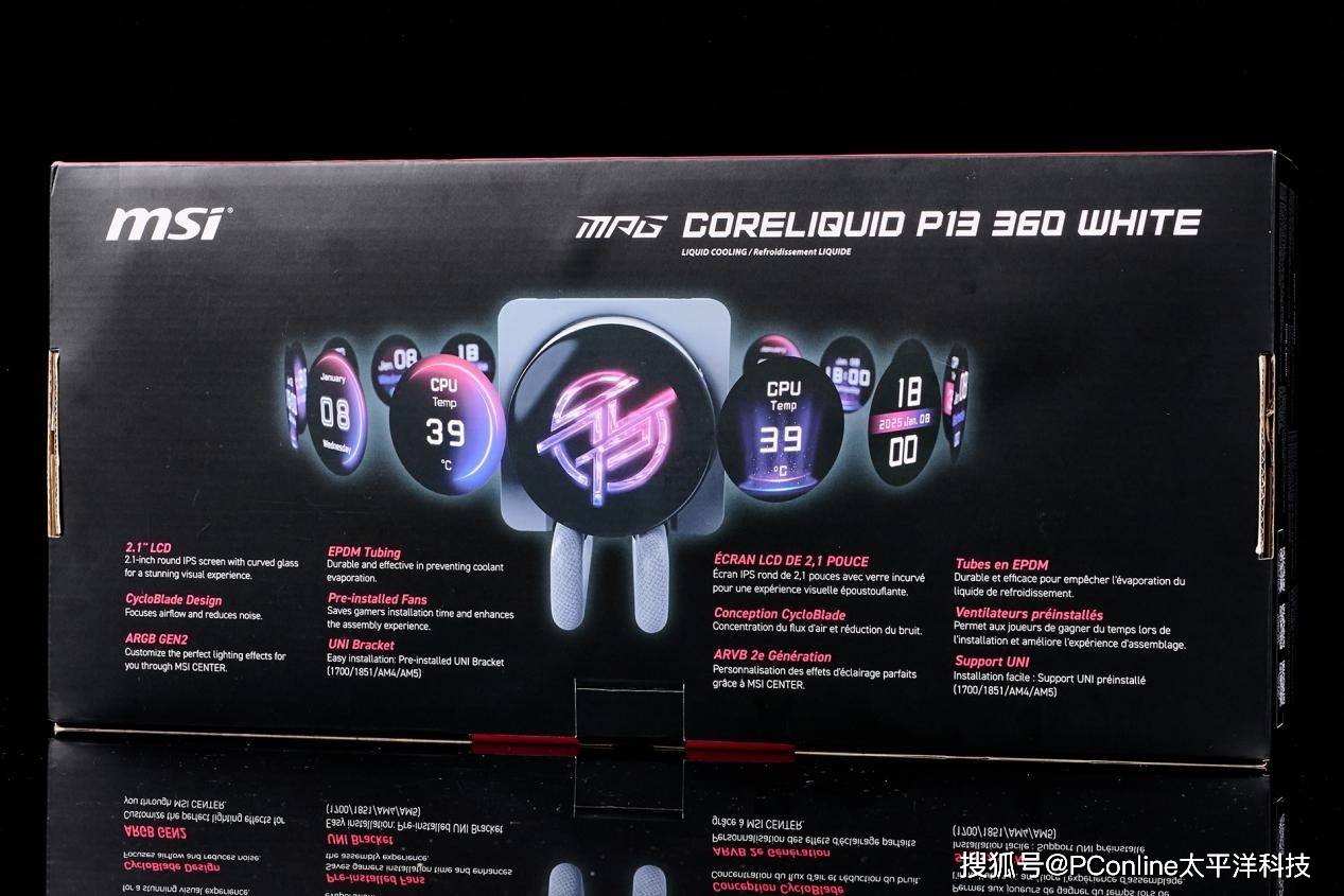 包装背部则是微星MPG CORELIQUID P13 WHITE冰曜一体水冷散热器的关键卖点:2.1英寸圆形LCD屏幕、CycloBlade设计、ARGB GEN2、EPDM水管、预装风扇,以及UNI预载支架等。
