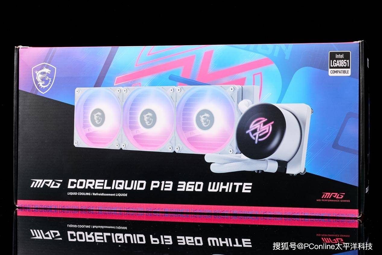 先来的是微星MPG CORELIQUID P13 WHITE冰曜一体水冷散热器的外包装,整体设计延续了微星新一代MPG系列“粉蓝”配色。其次是纯白设计的微星MPG CORELIQUID P13 WHITE冰曜一体水冷散热器产品渲染图。右上角还有“Intel LGA1851 COMPATIBLE”表示此款散热器能兼容Intel最新的LGA1851平台。