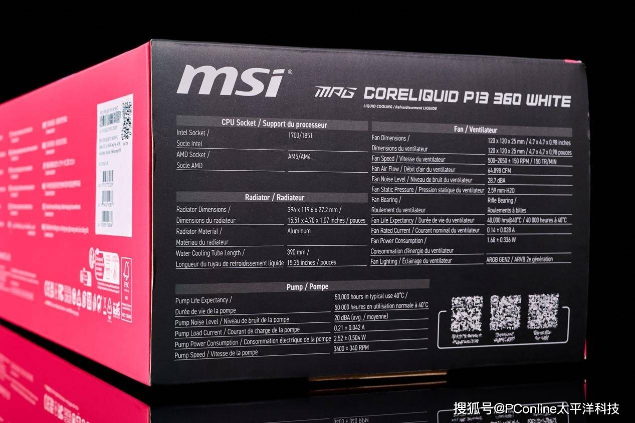侧面为此款产品的更为详细的规格:|产品型号| MPG CORELIQUID P13 360 WHITE|冷排尺寸| 394 x 119.6 x 27.2 mm (铝制)|风扇规格| 3 x 120 mm CycloBlade风扇,转速500~2050 ±150 RPM,噪音20 dBA (平均)|水泵寿命|预计>100,000小时,三相电机,低振动|水管长度| 800 ±15 mm,尼龙编织EPDM材质|冷头显示| 2.1英寸圆形IPS LCD,支持MSI CENTER自定义|灯效| ARGB GEN2,支持同步|兼容平台| Intel: LGA 1700/1851等;AMD: AM4/AM5|风扇连接| PWM 4-PIN,ARGB 3-PIN|最大功耗|水泵约5W,风扇约3W/把|保修| 3年微星MPG CORELIQUID P13 WHITE冰曜一体水冷散热器,外观