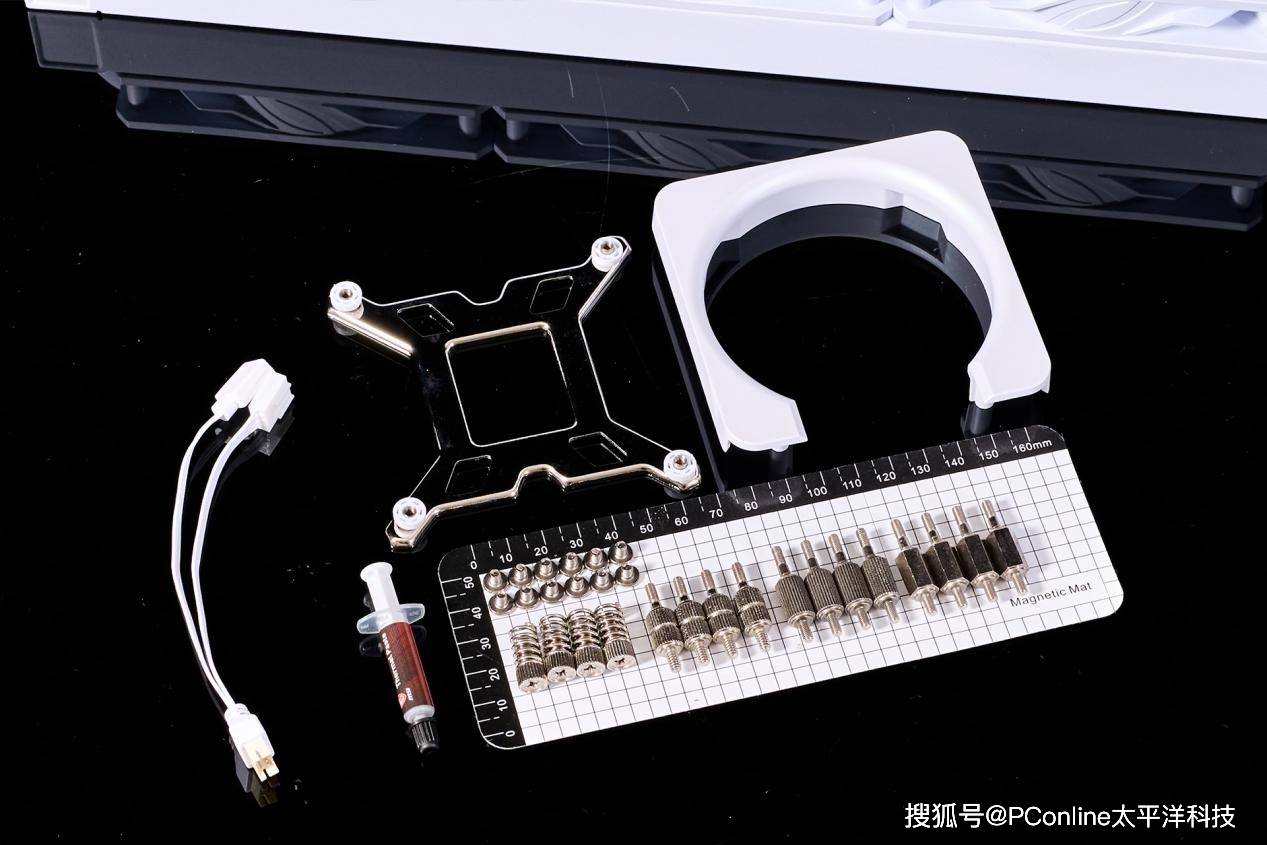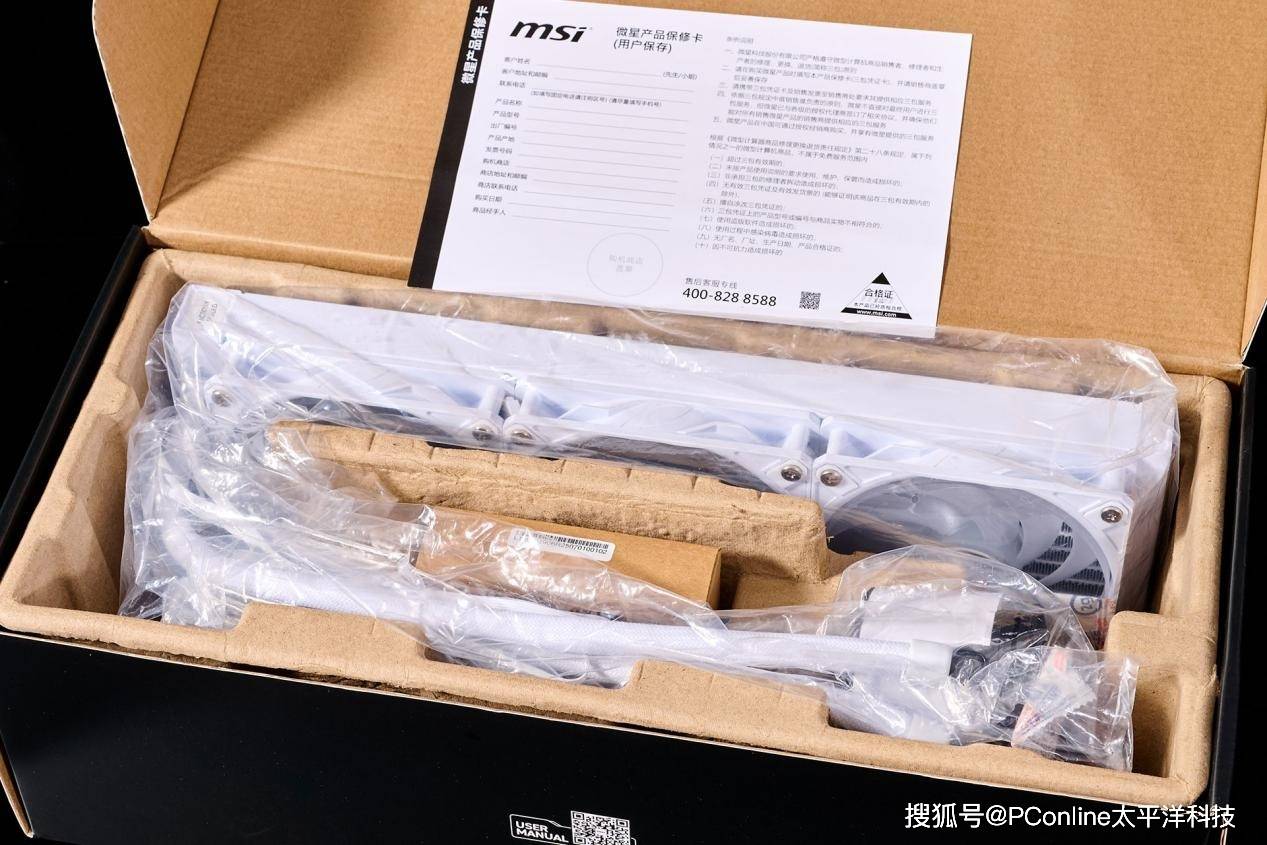 内部是微星MPG CORELIQUID P13 WHITE冰曜一体水冷散热器本身与水冷散热器配件,由定制的环保可降解纸托与保护袋提供防护。由于是预装式的设计,因此三把120mm风扇均直接被安装到冷排上。