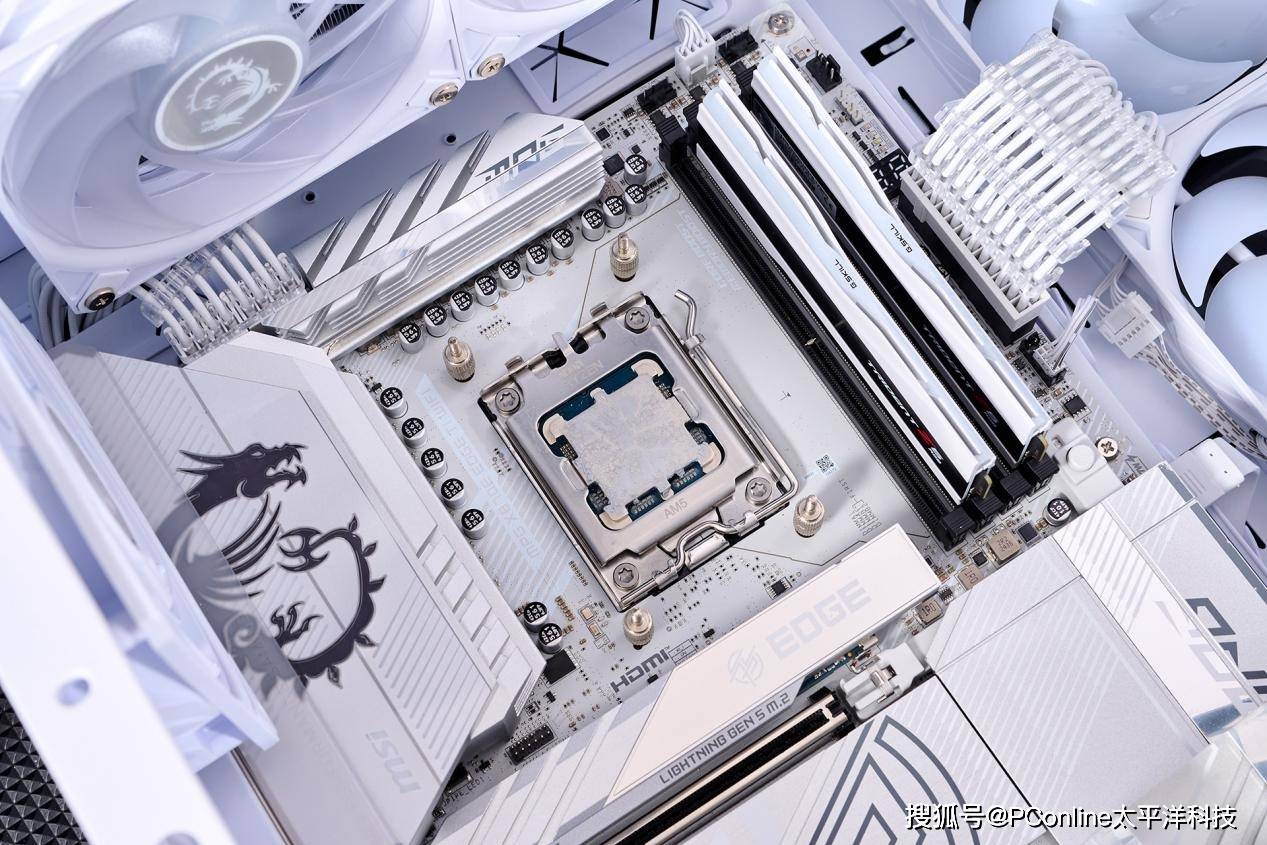 通电之后,同步我们利用MSl Mystic light进行灯效同步处理,整个主机的个性化效果就会出来了。水冷头上的全弧形玻璃盖无论是从哪个角度看都是较为好看,搭配上银白色的MPG X870E EDGE TI WIFI刀锋钛主板与刀锋300R白色机箱,ARGB纯白主机达成。