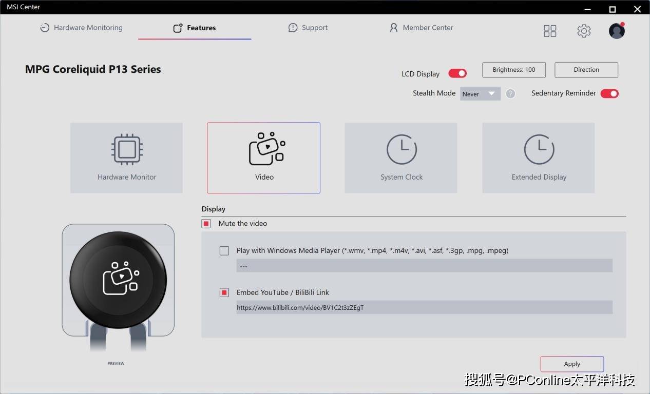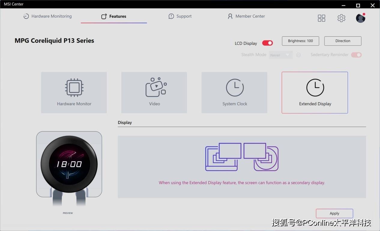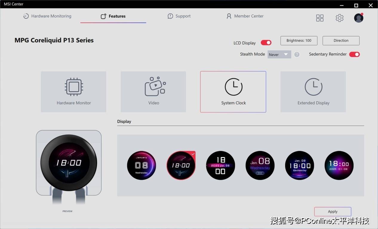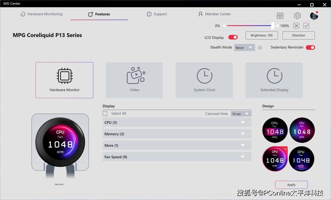 微星MPG CORELIQUID P13 WHITE冰曜屏幕可显示的信息还是相当多的,包括硬件监控、自定义视频、系统时间,以及默认副屏显示等。