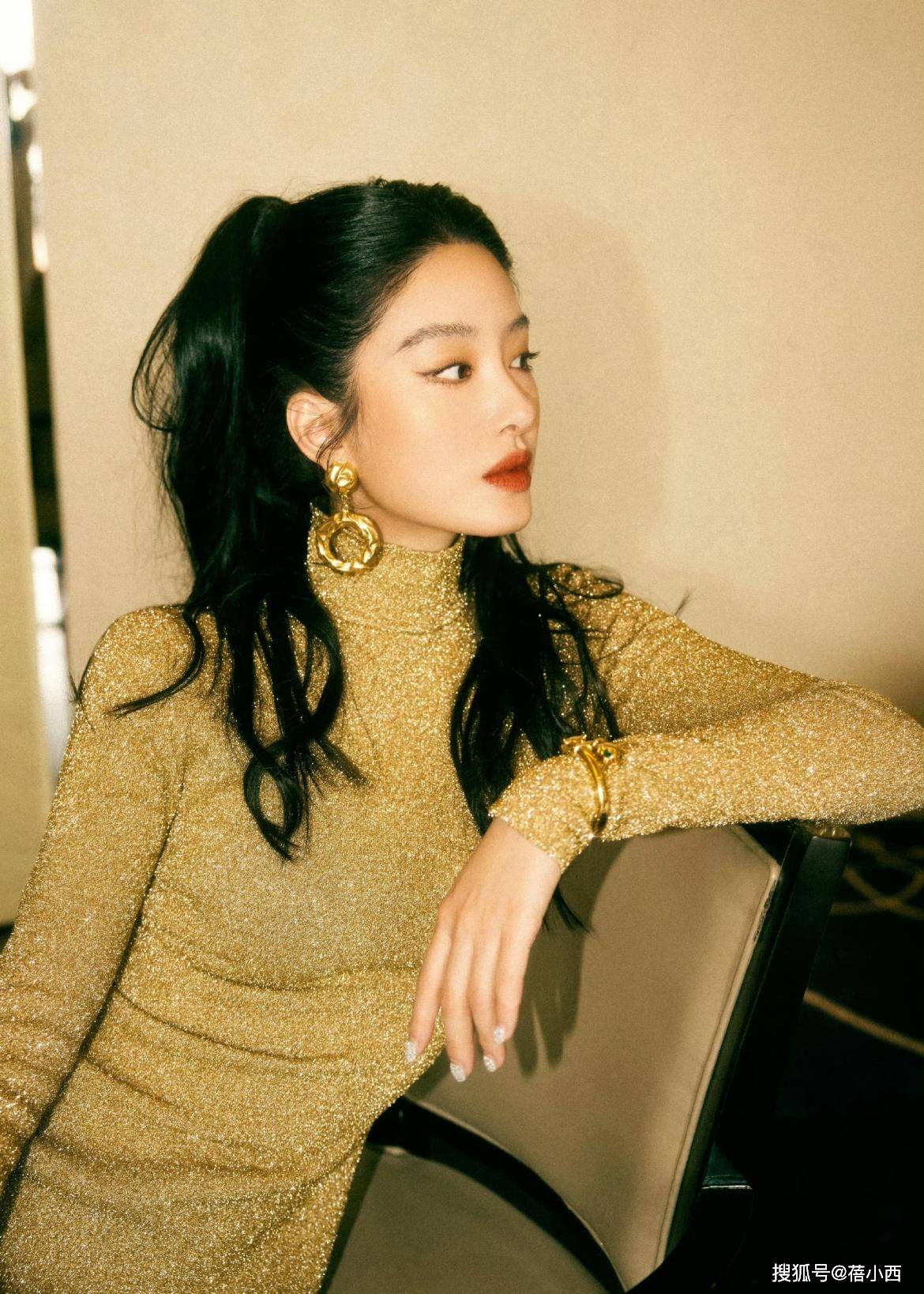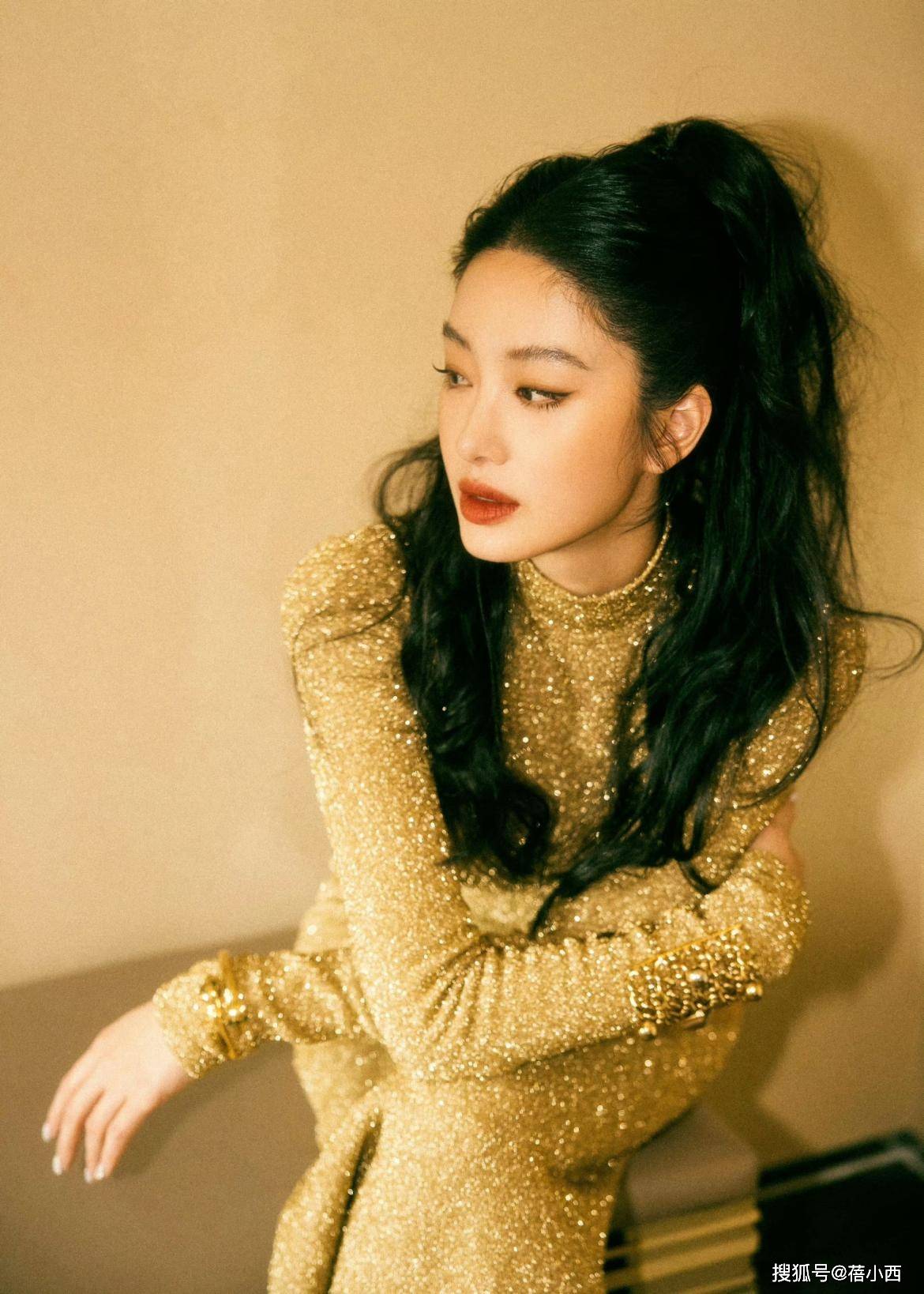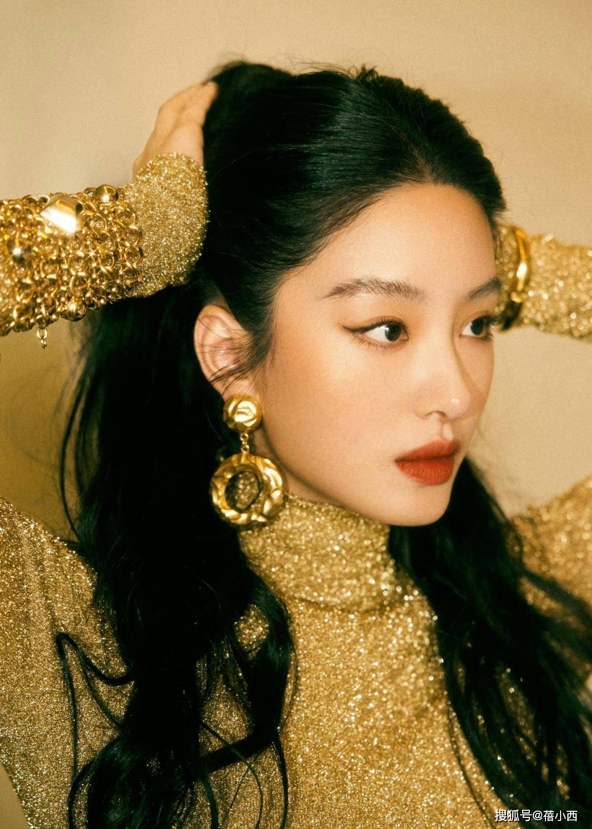 — 重写后的标题:杨采钰完美展现复古魅力,金色亮片长裙加半扎发美艳动人 —