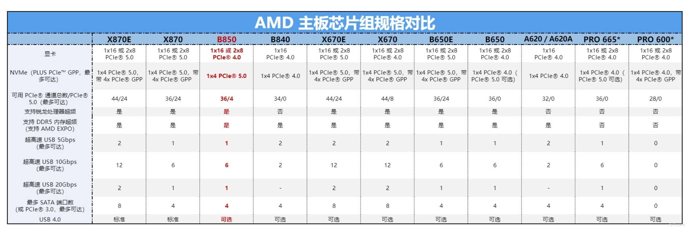 我们先来看看新的B850主板芯片组详细规格。作为一款主流级别的芯片组,AMD B850的规格无疑能够充分满足大多数用户的需求:1.它支持处理器与的超频;2.PCIe插槽与M.2插槽均支持最新的PCIe 5.0规范;3.原生提供USB 3.2 Gen2 x2 20Gbps接口;4.芯片组内置8条PCIe 4.0通道与4条PCIe 3.0通道。配合其合理的价格,主板制造商能够打造出性价比高、扩展性能出色的千元级别主板。