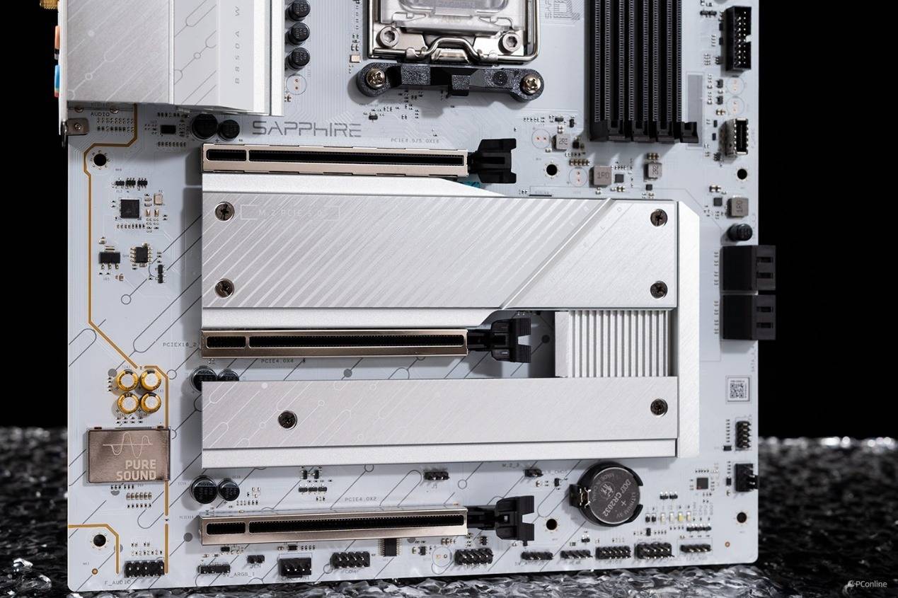蓝宝石PURE极地B850A WIFI主板共有三个M.2固态硬盘位,其中靠近CPU底座的一组为PCIe 5.0×4标准,剩下的两组则是PCIe 4.0×4标准。