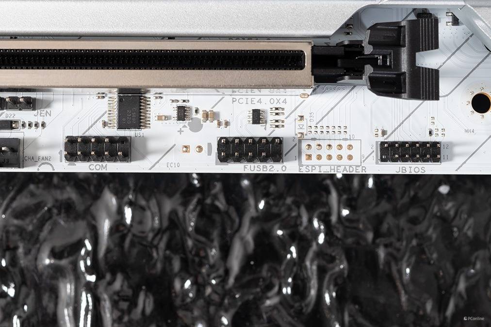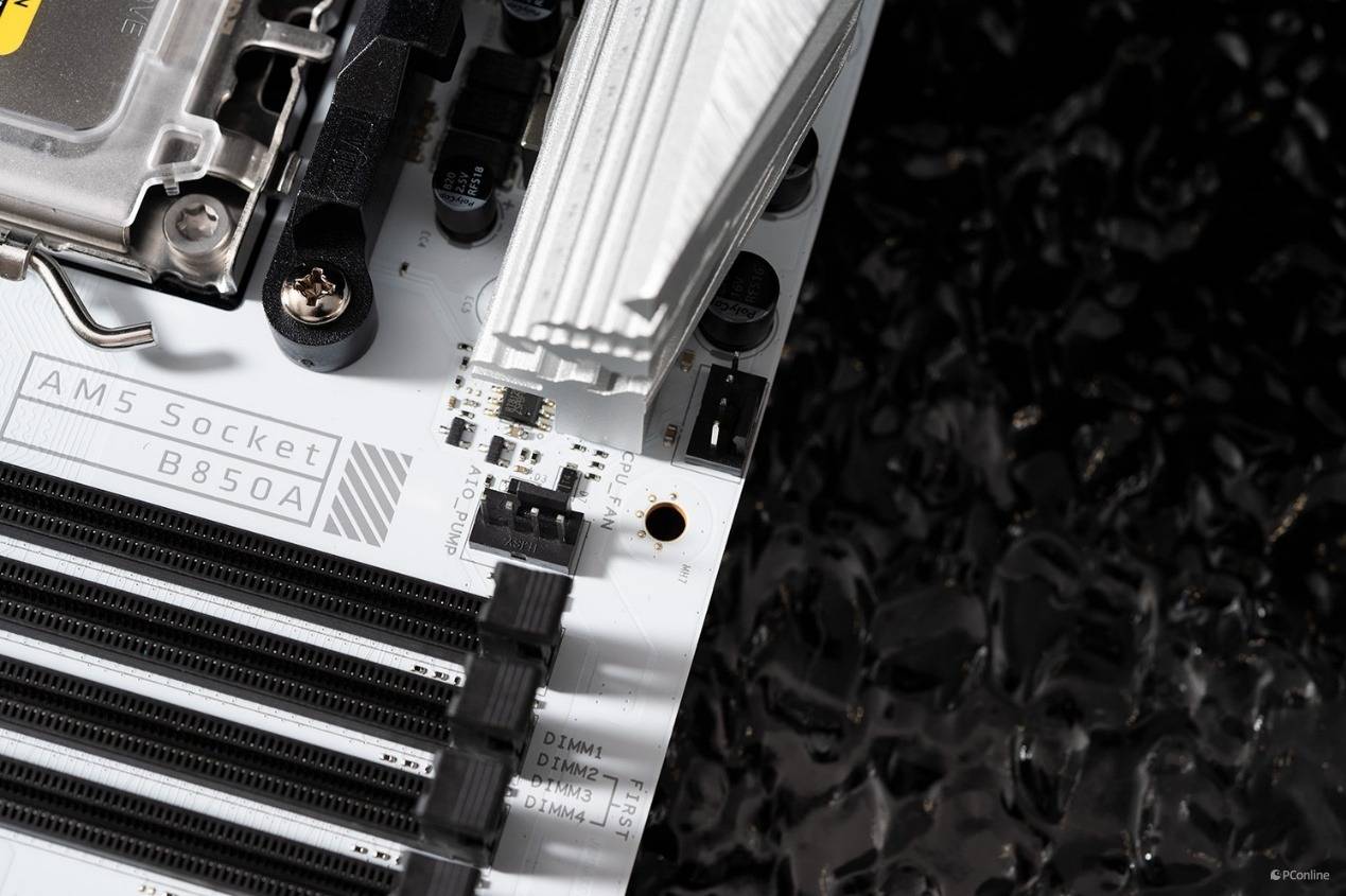 卸下外面的装甲以后就能看到B850芯片了,其主要负责I/O接口等一些外设接口的控制及提供部分PCIe通道。