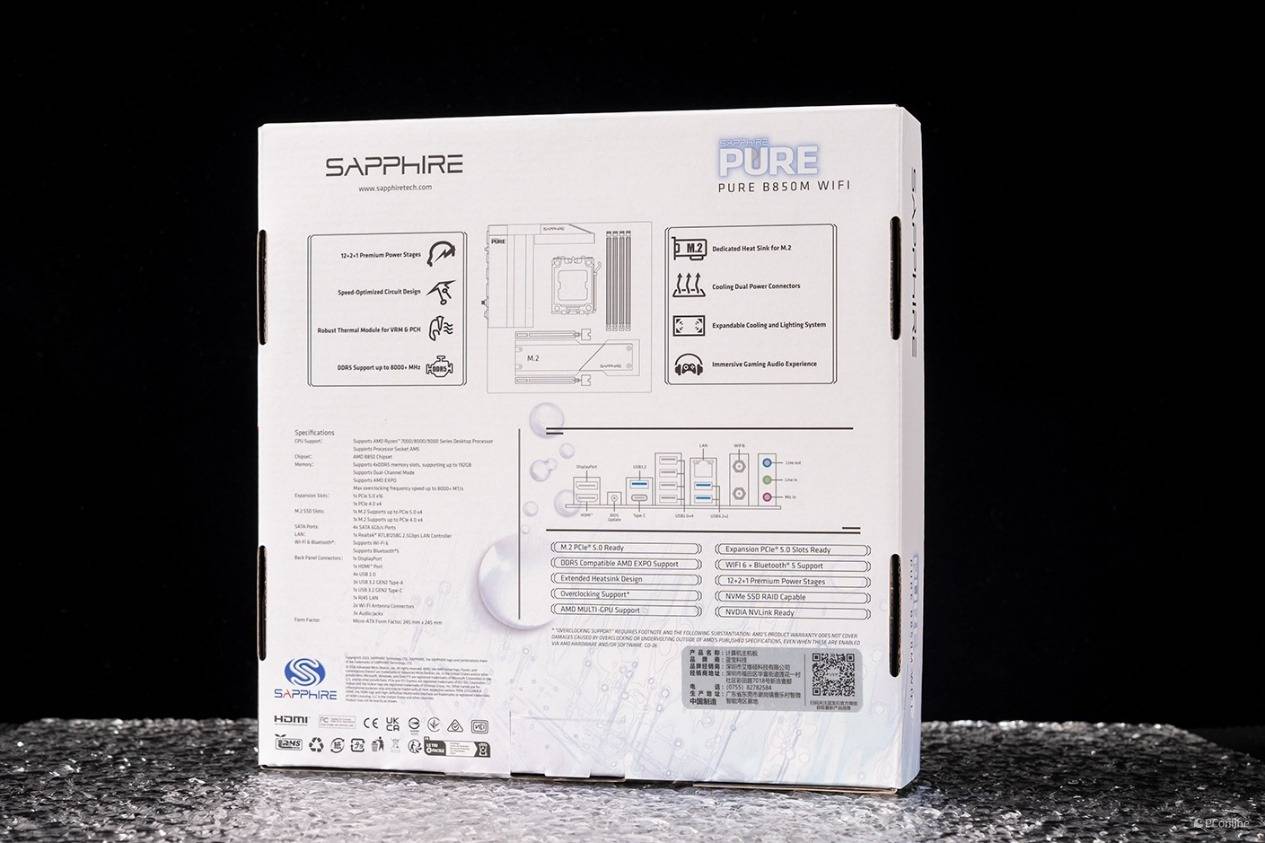 首先让我们先来看这次PURE极地B850系列的老大哥——蓝宝石PURE极地B850A WIFI主板,外包装设计上延续了过往PURE系列的特色,让人一眼就能看出这款主板主打的就是纯白设计,并且正面包装还有PURE系列独有的标识,科技感十足。