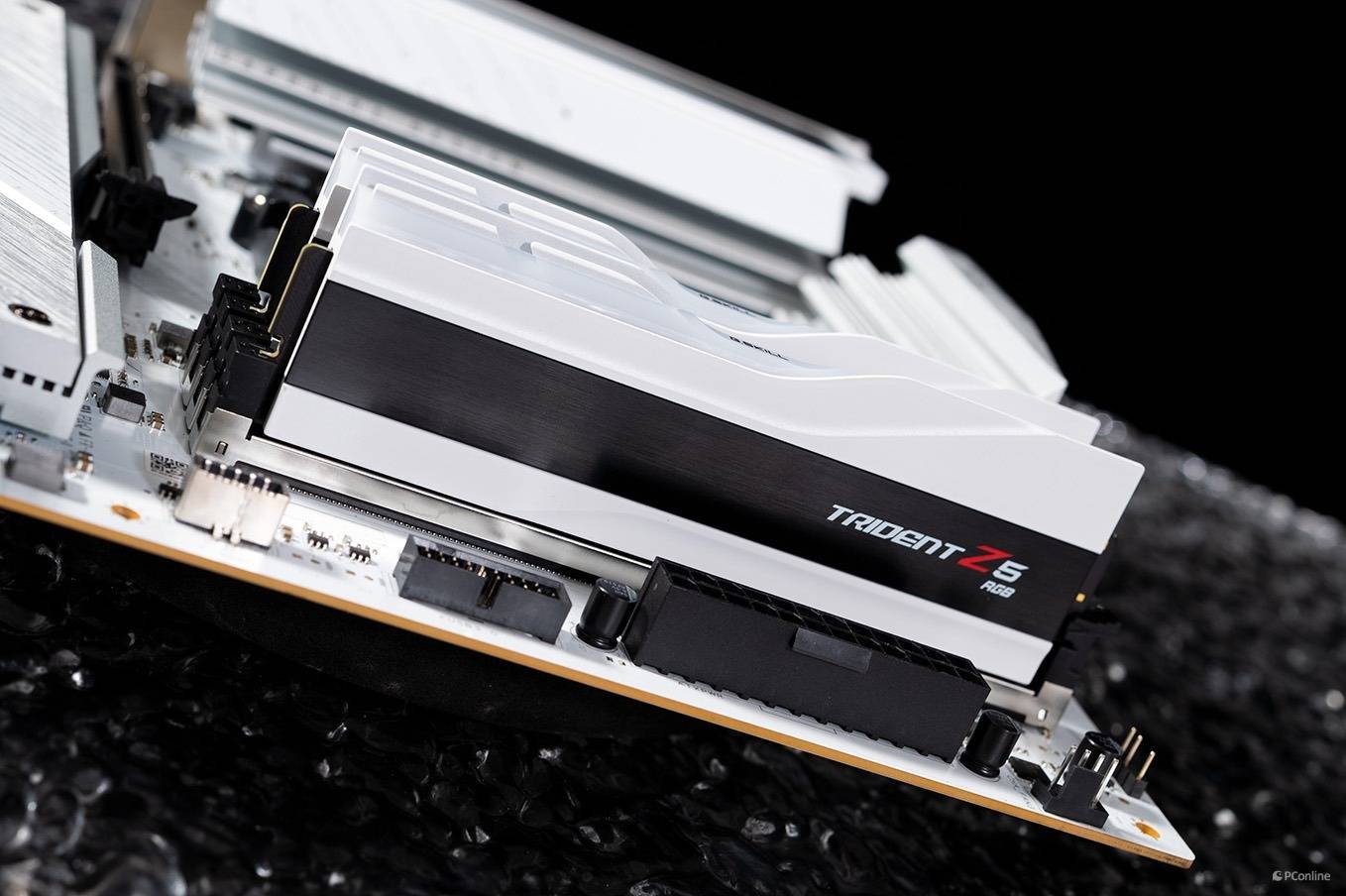 主板的右侧是内存插槽,一共有4槽DDR5 DIMM内存插槽,单槽可支持48GB容量,4槽最大能够支持192GB的双通道内存容量,内存频率也非常激进,最高可以实现8000MT/s。