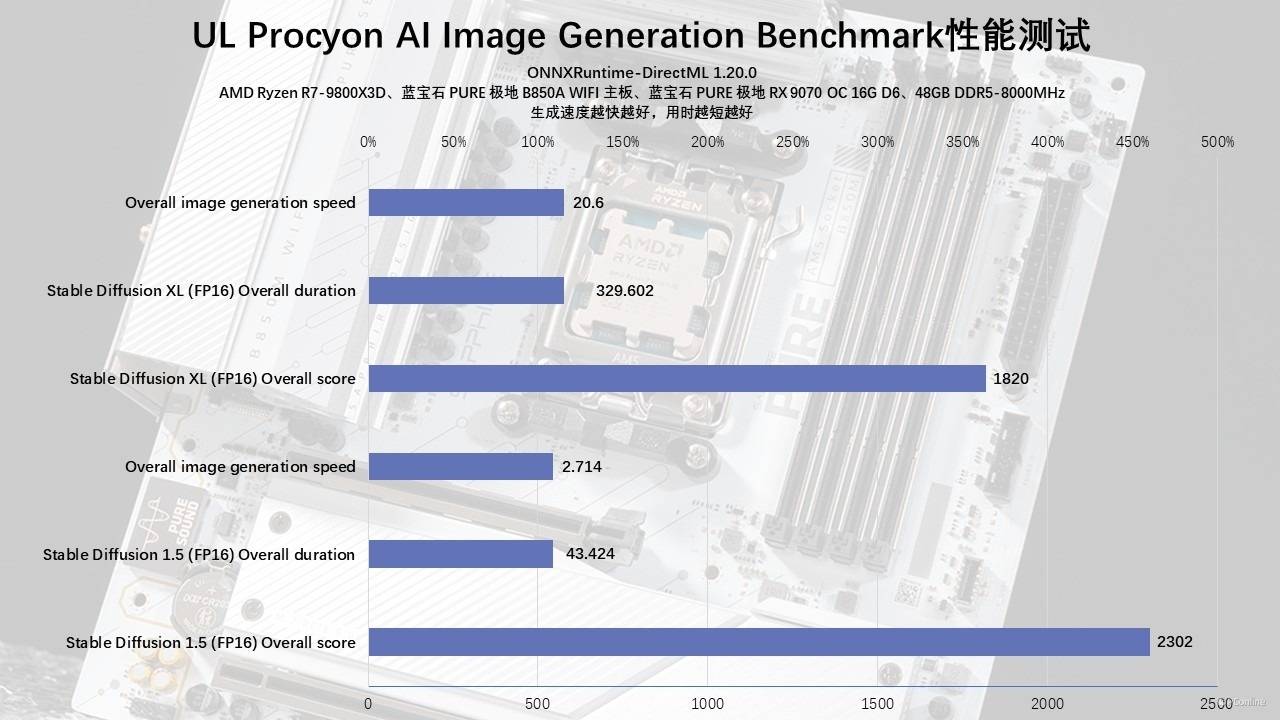 创作测试的最后,我们再来看看AI方面的表现,我们用UL Procyon测试了这套平台的AI文生图性能,实测这套平台能够在SD1.5中实现2.714s出一张图的实力,而在SDXL测试中,也能够实现20.6s即出一张图,整体表现还是非常出色的。
