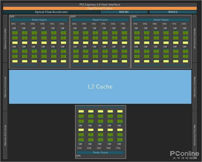 从下图可以看到,完整的AD104核心应该包括5个GPC(图形处理集群)、30个TPC(纹理处理集群)、60个SM(流式多处理器)以及一个带有6个32Bit显存控制器的256Bit显存带宽。