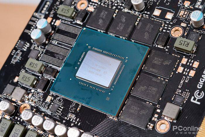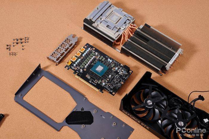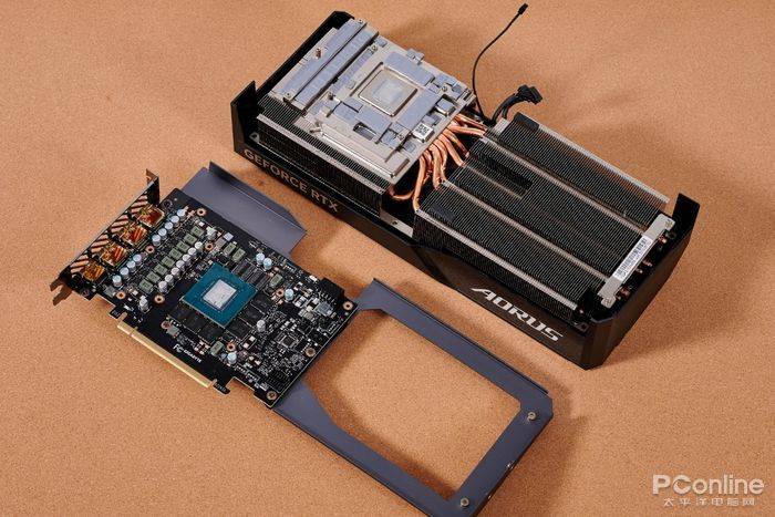 显卡拆解也是评测不可或缺的一部分,拧下金属背板上的多颗螺丝后,PCB就可以跟散热系统分离了,整体拆解难度不大。从这张图可以看到技嘉上用到的这个散热系统堪称巨大,想必它的散热效能也是一流的水平。