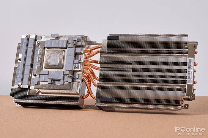 散热器本体为两段式散热模块,左边是庞大的均热板,右边是密密麻麻的散热鳍片。