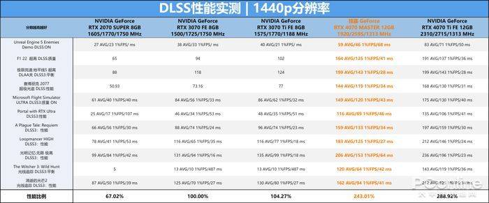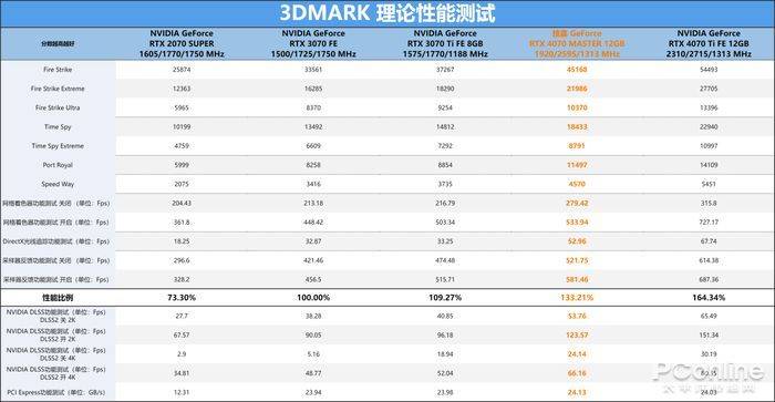 特别是加入了公版RTX 2070 Super、RTX 3070Ti和RTX 3070作为参照后,这张新显卡的优势尽显,不论是在常规的显卡性能测试,还是设计DLSS功能的性能表现,其成绩数据体现了要全面优于上一代RTX 30系列,理论性能表现是RTX 3070的1.3倍,约为RTX 3070 Ti的1.2倍。