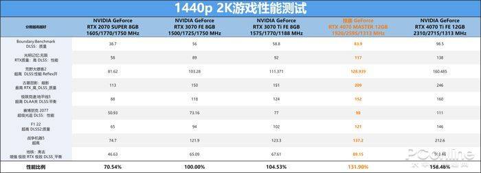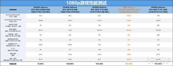 总算来到游戏玩家期待已久的游戏测试环节了,先看看1080P下的成绩,技嘉RTX 4070 MASTER一骑绝尘,不少游戏都超过了150 FPS以上,要知道这还是只是开启DLSS 2的情况,如果搭配老黄的独门秘技DLSS 3一起使用,这个成绩还将有翻倍的提升。更直观的对比下,这张新显卡对比RTX 2070 Super,帧数几乎是翻倍的提升,即便是面对上一代的RTX 3070或RTX 3070 Ti,在DLSS 2下已经有30+ FPS的差距了。