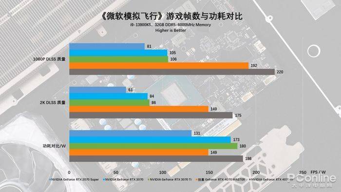 光测试理论性能肯定是不够的,现在支持DLSS 3的游戏已经上升至50款,因此我们也选用了一些热门游戏进行详细测试。在对硬件要求颇高的《微软模拟飞行》中,技嘉RTX 4070 MASTER开启DLSS 3后对RTX 3070 Ti简直是降维打击,1080P分辨率下几乎是2倍的帧数提升,2K分辨率下也比RTX 3070 Ti高出60多 FPS。另外值得称赞的还有技嘉RTX 4070 MASTER仅用149W的功耗就实现了2倍于RTX 2070 Super的性能!这波Ada Lovelace架构与TSMC 4N工艺功不可没。