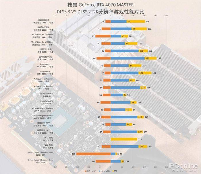 我们也使用技嘉RTX 4070 MASTER在DLSS 2和DLSS 3两种模式下测试了多款游戏,从实测结果来看,DLSS 3确实有点东西,不少游戏的帧数都有明显提升,其中不乏一些游戏有翻倍的性能提升。