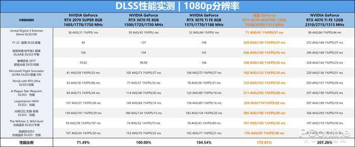 例行惯例,先测技嘉RTX 4070 MASTER在1080P下的游戏表现,实测这张显卡在开启DLSS 3后,游戏性能直接是RTX 2070 Super的2倍有多!不少游戏直接飙升至200+ FPS以上,面对上代的同门师弟,技嘉RTX 4070 MASTER领先RTX 3070 Ti 70%以上!可以说托DLSS 3的福,游戏性能有了质的飞跃。