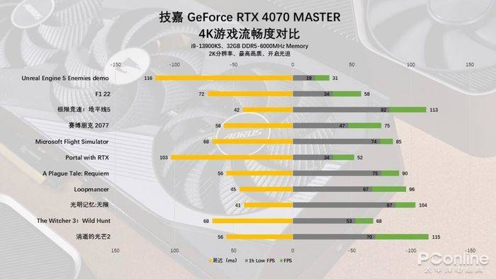虽然说这是一张定位2K 100+FPS游戏级别的显卡,但技嘉RTX 4070 MASTER仍是具备一定的4K游戏能力,只要把DLSS 3一开,或者是把游戏画质降低一些,游戏流畅度就直接上来了,跑个60+FPS不成问题。