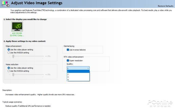 今天我们也测试了这项划时代的RTX VSR技术,在RTX 30系和RTX 40系的NVIDIA控制面板中找到视频图像设置,手动开启RTX Video enhancement即可启用RTX VSR技术,其中分为1-4档调节,数字越大质量越好。