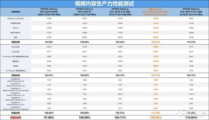 理论与游戏上的性能提升已经足够惊艳,在创作生产力上能否再续辉煌?我们选择PugetBench、PCMark 10、UL Procyon等多款常见的测试软件,来测试技嘉RTX 4070 MASTER在日常办公、视频内容生产方面的表现。