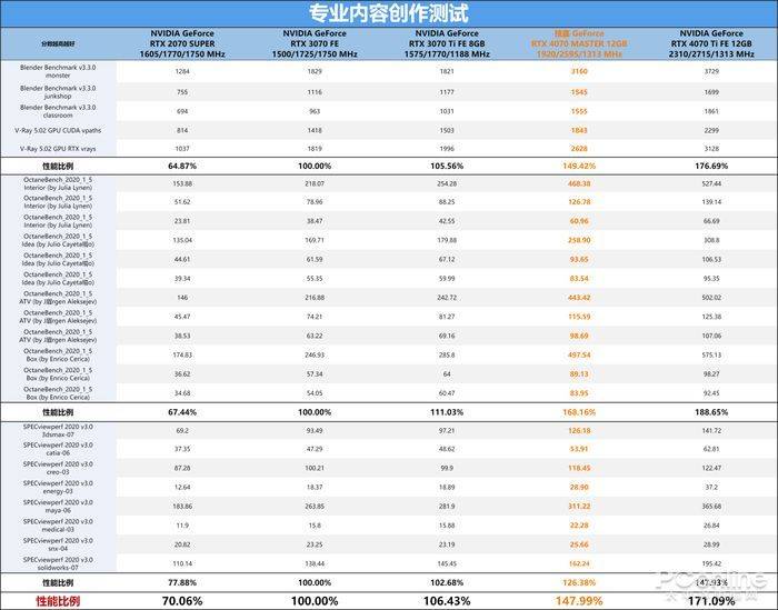 再看看专业生产力部分,这里的提升可以用离谱来形容!单是OC渲染器一项,技嘉RTX 4070 MASTER的渲染性能领先RTX 3070 Ti有50%之多,如果对比同代的RTX 3070,差距将拉大到60%!当然在Blender或V-Ray中,它的表现依旧不凡,整体领先幅度依旧达到了50%以上,说人话就是换装这张新显卡,你至少比别人快出一半的渲染时间,效率大幅提升。