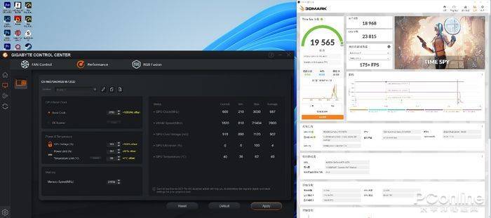 从上面的GPU-Z中可知,技嘉RTX 4070 MASTER的TDP给到了惊人的350W,显然这是给超频党留了充足的余量。笔者自然是不能放过这个绝佳的机会,这里使用技嘉的GCC软件解锁显卡的电压与温度限制后,超频正式开始!
