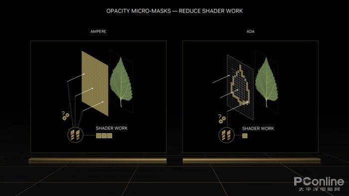 所以在第三代 RTX Cores增加了两个重要硬件单元:Opacity Micromap Engine与Displaced Micro-Meshes Engine引擎。Opacity Micromap Engine,主要是用于alpha通道的加速,可以将 alpha 测试几何体的光线追踪速度提高2倍。