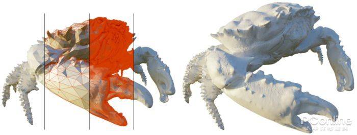 通过NVIDIA给出的创建14:1珊瑚蟹例子来说事,这里我们需要1.7万个微网格、160万个微三角形,在Ada Lovelace架构中BVH创建速度可加快7.6倍,存储空间缩小8.1倍。Displaced Micro-Meshes Engine起到了关键性的作用,其将一个几何物体根据不同细节分成密度不一的微网络处理,红色密度超高,细节处理越为复杂 。相应的低密度微网络区域则可以释放更多的资源与存储空间,这样Displaced Micro-Meshes Engine就可以帮助BVH加速过程,减少构建时间和存储成本。