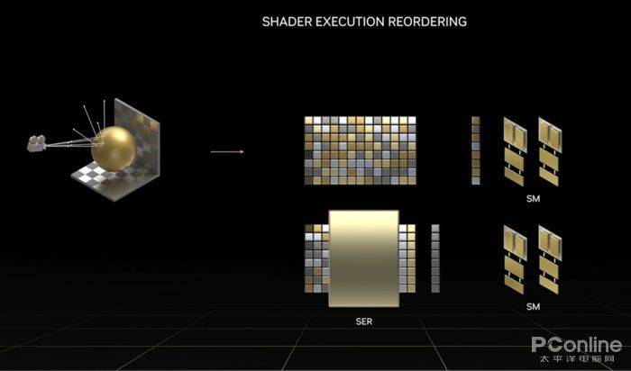 同时Ada Lovelace架构SM中新增了着色器执行重排序(Shader Execution Reordering,SER),这是由于光线追踪不再只有强光或者阴影渲染处理,未来将会更多的是在光线的运动性,这样光线就会变得越来越复杂,想要第三代 RTX Cores与第四代 Tensor Cores有着更高的执行效率,那就得为他们来安排一位管家。而着色器执行重排序(SER)就是为了能够即时重新安排着色器负载来提高执行效率,为光线追踪提供2倍的加速,也能更好地利用 GPU 资源。不过目前仍未有实例,想实现这个功能,还得游戏与开发工具的支持才行。